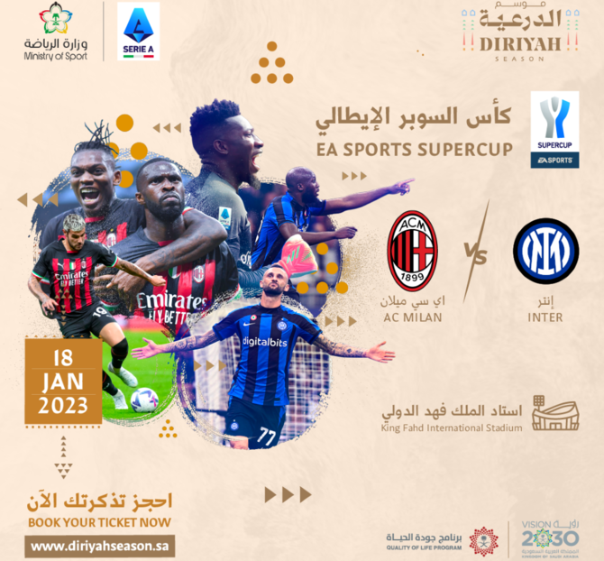 RIYADH: Diriyah Season 2022 has released the first batch of tickets for the Italian Super Cup, which will bring two giants of Italian football, AC Milan and Inter Milan, together at King Fahd International Stadium in Riyadh on Jan. 18, 2023.