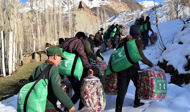 In this handout picture released by King Salman Humanitarian Aid and Relief (KSrelief) on December 14, 2022, shows people carrying winter relief packages in northern Pakistan. (Photo courtesy: KSrelief)