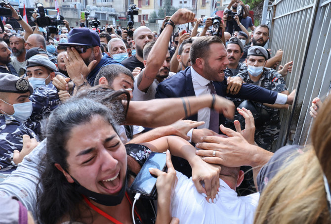 Activists and relatives of victims of the Beirut port explosion scuffle with security officers during a demonstration on Sept. 29, 2021 in the Lebanese capital. (AFP file)