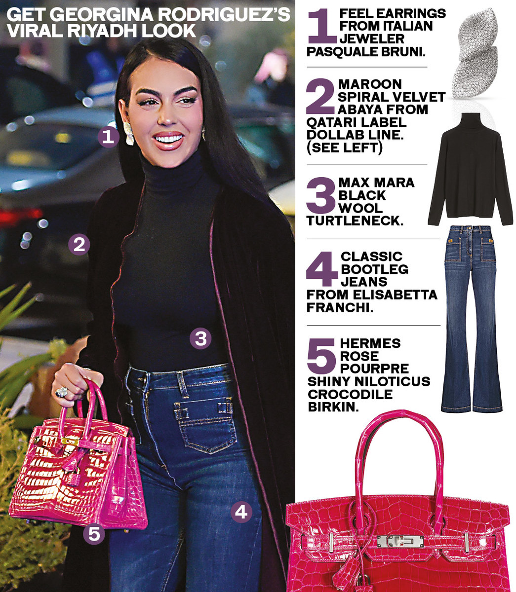 Her latest outing in Saudi Arabia was not the first time Rodriguez was spotted wearing an Arab label, however. In Doha last month for the 2022 FIFA World Cup, she opted for a sage green abaya by Qatari brand 1309 Studios while cheering for Portugal at Lusail Stadium.