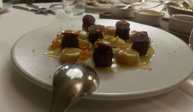 We then had seasonal vegetables served with uniquely flavored dips, an Italian salad made with tomato cubes, black olives, basil leaves, and shallots, followed by salted baked beetroot with smoked goat’s cheese and gel made from AlUla’s oranges.