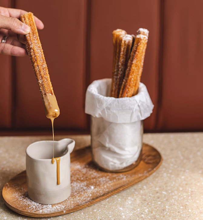 The profiteroles come with a custard center and are topped with melted chocolate, while the restaurant’s iconic churros are coated with cinnamon and sugar powder.
