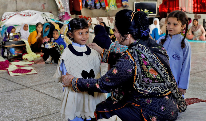 KARACHI: Women pedal sewing machines, deftly lining up seams and pleats as they assemble brightly colored dresses for young girls at an orphanage in Pakistan, in preparation for Eid Al-Fitr, which ends the Muslim fasting month of Ramadan.