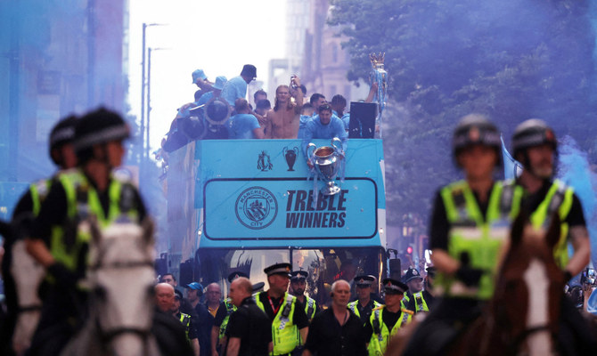 MANCHESTER, England: Rain poured as Manchester City’s players celebrated winning the treble of major trophies with an open-top bus parade through the city center in front of tens of thousands of fans on Monday.
