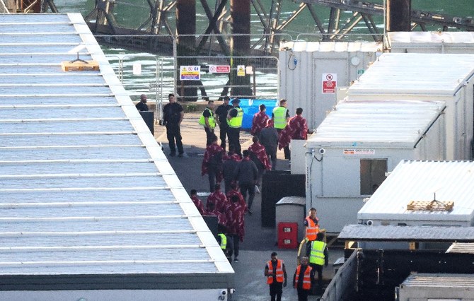 Migrants are escorted by UK Border Force and Interforce officers at the Marina in Dover, southeast England having been picked up at sea while attempting to cross the English Channel from France.(AFP)