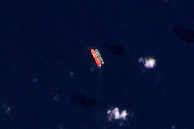 - Ship-tracking data shows the Marshall Islands-flagged tanker is undergoing a ship-to-ship transfer of its oil