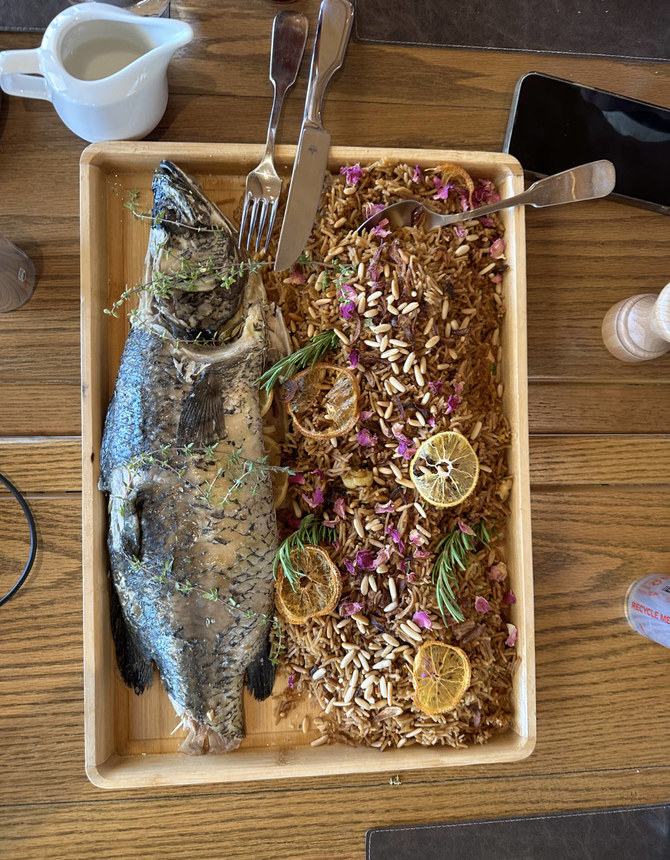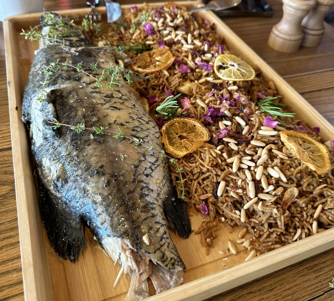 For the main, they also offer the festive Sayadieh, an Egyptian dish. It features a big Lethrinus nebulosus fish on a tray, accompanied by brown rice adorned with rosemary, rose petals, lemon slices, and roasted pine nuts.
