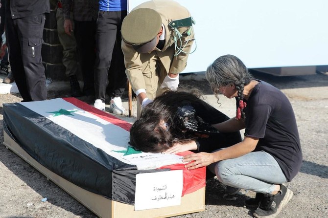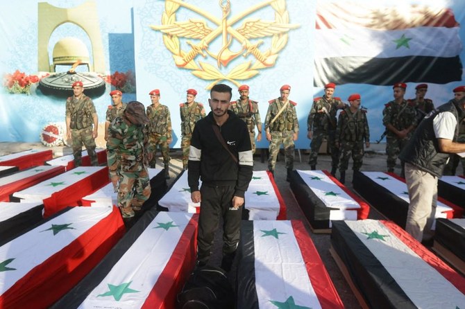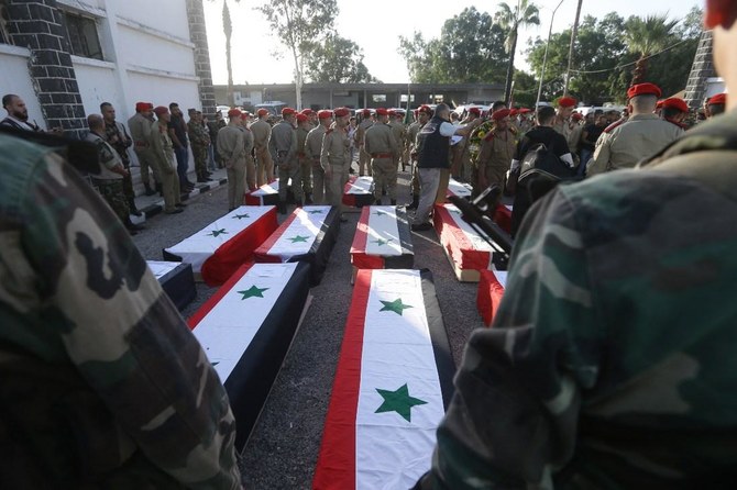 Military personnel saluted as caskets draped in Syrian flags were carried one by one to ambulances for transportation for burial.