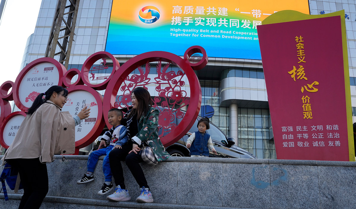 Residents rest near a display for the upcoming Third Belt and Road Forum in Beijing, China on October 16, 2023. (AP/File)