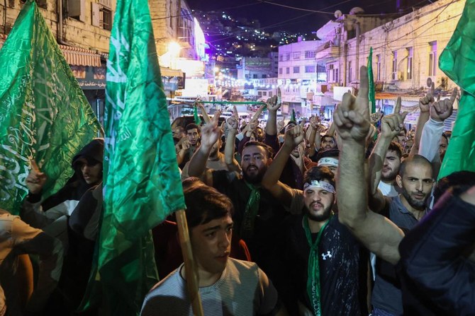 Hundreds of protesters in Nablus, many draped in Palestinian flags and some holding Hamas banners, chanted slogans against Israel and its ally the United States.