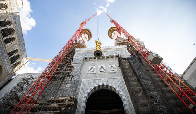 The structure was hoisted into place on the minaret of Bab Al-Fath as part of a major building expansion program at the holy site. (Supplied)