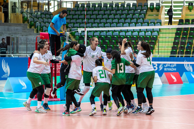 The Green Hall at Riyadh’s Prince Faisal bin Fahad Olympic Complex hosts volleyball action, featuring both men’s and women’s teams as part of Saturday’s competitions.