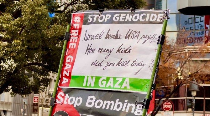 TOKYO: Gaza sympathizers gathered in the crowded Shibuya district of Central Tokyo on Saturday to honor the lost lives of about 15 thousand Palestinians – many of them small children and babies, murdered by the Israeli military occupation.