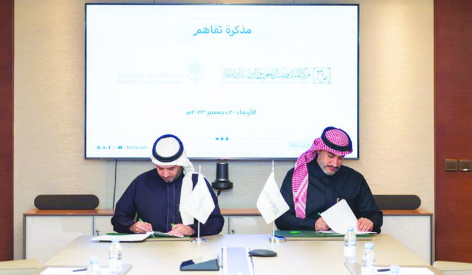 RIYADH: On Wednesday at the King Faisal Center for Research and Islamic Studies’ headquarters, the Ministry of Economy and Planning’s Deputy Minister for Strategic Planning and Organizational Excellence Fahad Al-Humaidah and the center’s Assistant Secretary-General Ibrahim Al-Deghaither signed a memorandum of understanding.