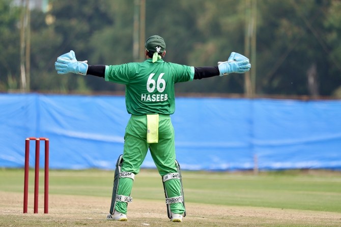 But Hasan’s unbeaten run was ended as he was caught and bowled by Ram Sharan, and Khan returned to the crease at the first opportunity and immediately hit a four to bring up the Saudi 50 from exactly six overs.