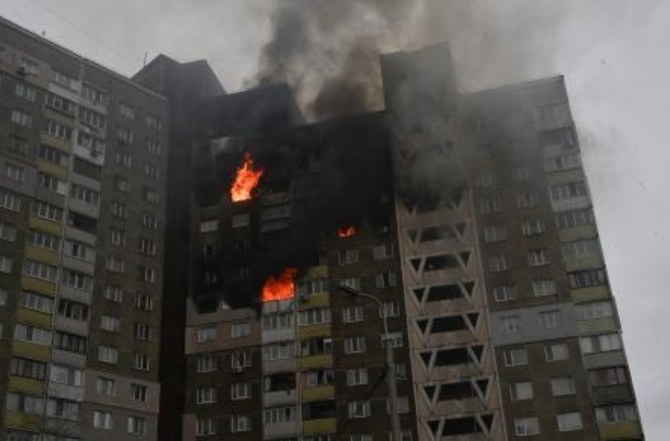 Apartment buildings caught fire in multiple Kyiv districts, Mayor Vitalii Klitschko said. Two power lines damaged during the attack left about 20,000 households on Kyiv’s east bank without power.
