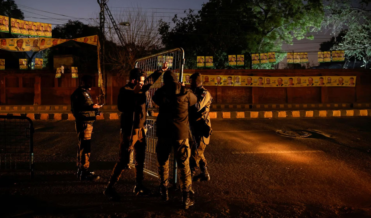 Policemen set up barricades near a polling station on the day of the general election, in Lahore, Pakistan February 8. (REUTERS)