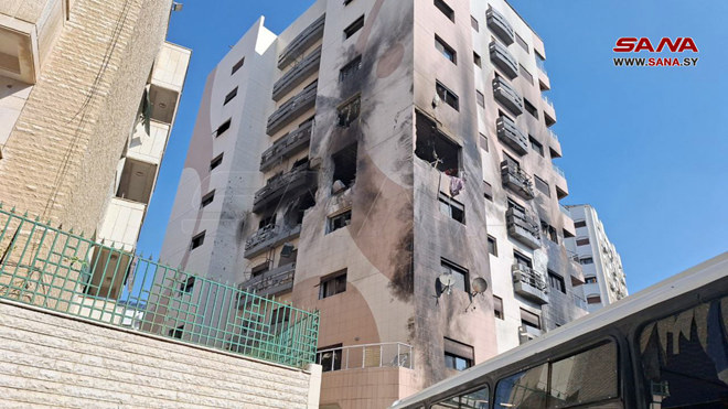 The strike damaged the fourth floor of a 10-story building, shattered window glass on nearby buildings and also damaged dozens of cars parked in the area. An empty parked bus for the nearby Al-Bawader Private School was also damaged and people were seen rushing to the school to take their children.