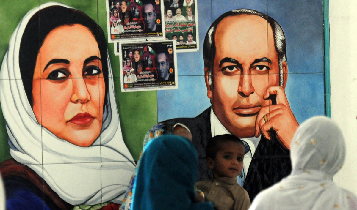 This photograph taken on April 4, 2013 shows supporters of Pakistan People's Party (PPP) walking past the portraits of former premier Zulfikar Ali Bhutto (R), father of Pakistan's slain former premier Benazir Bhutto (L), at the Bhutto's mausoleum in Garhi Khuda Bakhsh near Larkana on his death anniversary. (AFP/File)