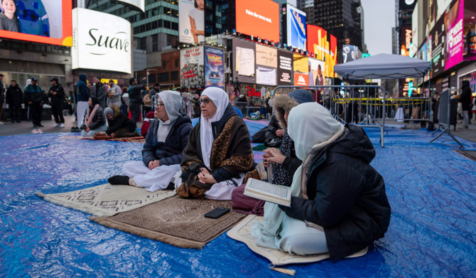 NEW YORK: Dozens of Muslim worshippers gathered in New York’s Times Square Sunday to mark the start of the holy month of Ramadan, with some displaying Palestinian flags in solidarity with people in Gaza.