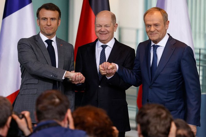 After the meeting, Macron said the three countries of the so-called Weimar Triangle were “united” in their aim to “never let Russia win and to support the Ukrainian people until the end.”