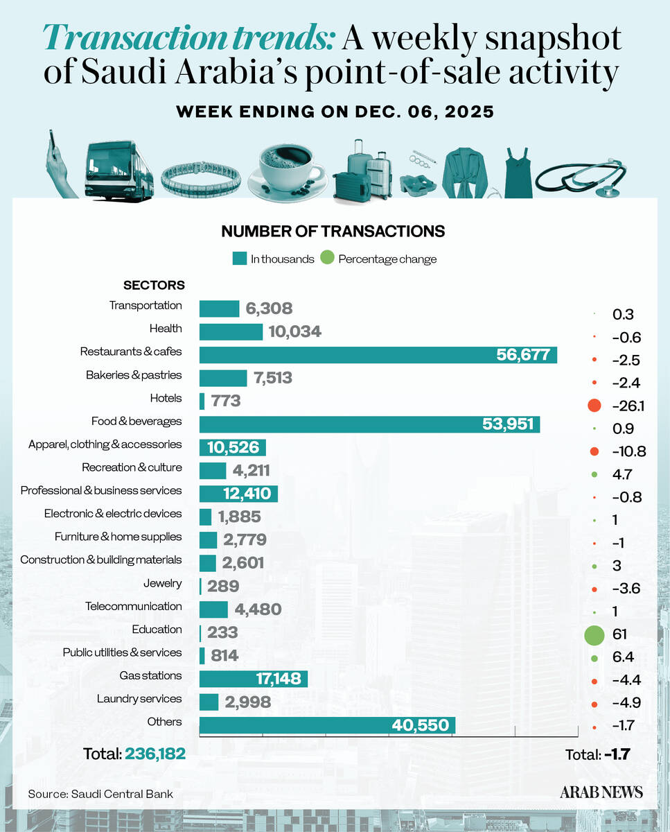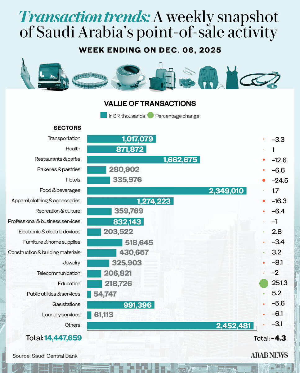 The largest portion of POS spending in January was allocated to beverages and food, comprising 16 percent of the total at SR8.44 billion. It was followed by spending on restaurants and cafes, accounting for 15 percent and reaching SR8.14 billion, according to the central bank, also known as SAMA, data.