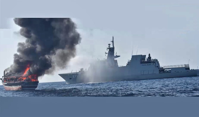 A Pakistan Navy ship, Yarmook, heard a distress call from the fire-stricken boat and swiftly acted, the Pakistani military’s media wing said on Monday, adding that a successful rescue operation was carried out on humanitarian grounds, with all eight fishermen rescued and the fire extinguished.