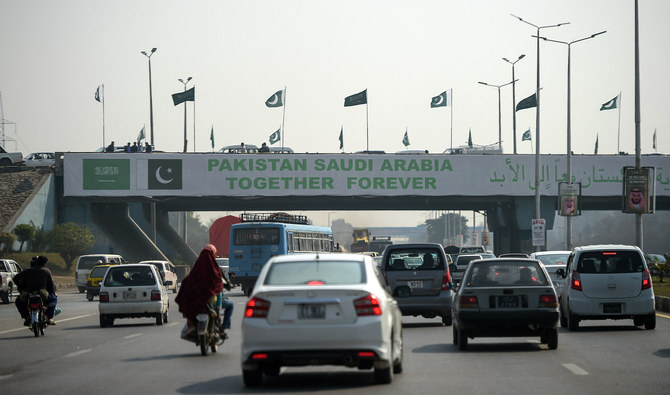 Pakistani commuters drive their vehicles under a banner welcoming Saudi Arabian Crown Prince Mohammed bin Salman displayed on a bridge, ahead of his arrival, in Islamabad on February 15, 2019. (AFP/File)