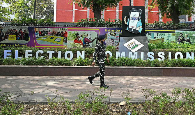 People walk past a model of Electronic Voting Machine (EVM) displayed outside the office of the Election Commission of India, ahead of the country's upcoming general elections, in New Delhi on April 15, 2024. (AFP)
