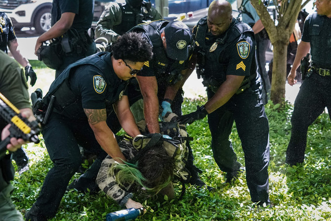 Police officers arrest a demonstrator during a pro-Palestinian protest against the war in Gaza at Emory University on April 25, 2024, in Atlanta, Georgia. (AFP)