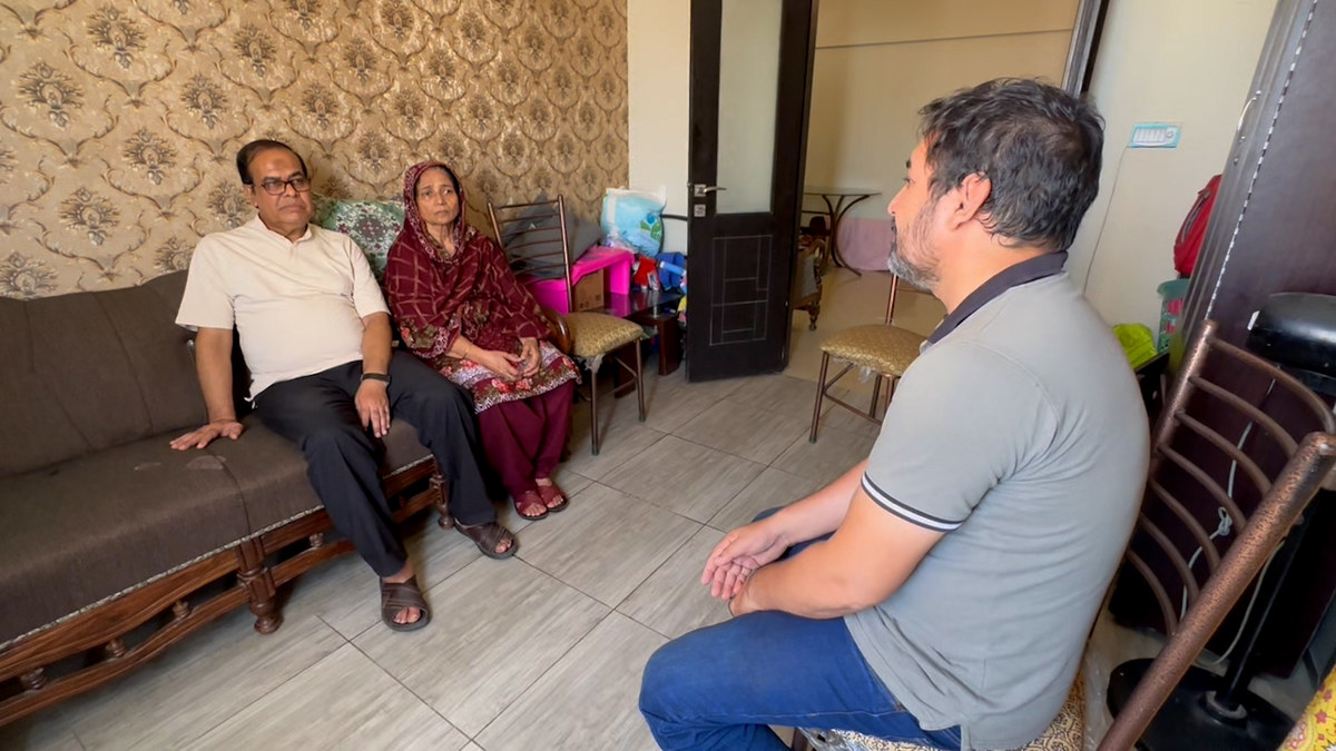 The photo taken on April 26, 2024, shows Syed Turrab Hussain Zahedy's parents during an interview with Arab News in Karachi, Pakistan. (AN Photo)