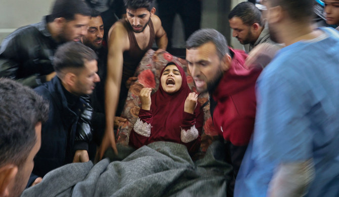 Day breaks as a survivor of an Israeli airstrike on southern Gaza, who was displaced from Gaza City and sought refuge with family in the city of Khan Younis, lays his head on the corpse of a female relative named Tamam, which lies alongside family members who were killed in the strike, in Nasser hospital, Khan Younis, Gaza, October 24, 2023. (REUTERS)
