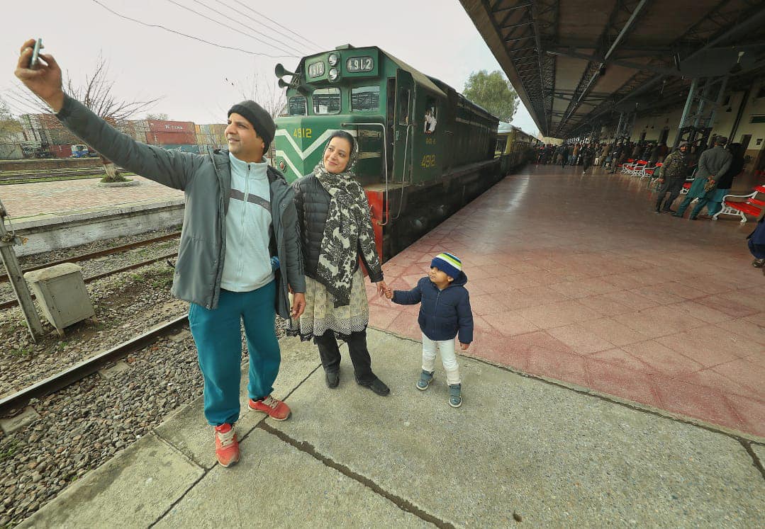 In this photograph, taken on March 3, 2024, a man takes the family photo ahead of their journey on “Safari Tourist Train” at the Saddar Railway Station in Rawalpindi. (Photo courtesy: KP Culture and Tourism Authority)