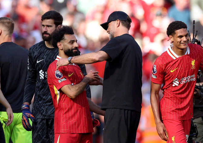 Juergen Klopp, right, celebrates with Mohamed Salah after his last match as Liverpool manager against the Wolverhampton Wanderers and his team won 2-0 on May 19, 2024. (Reuters)