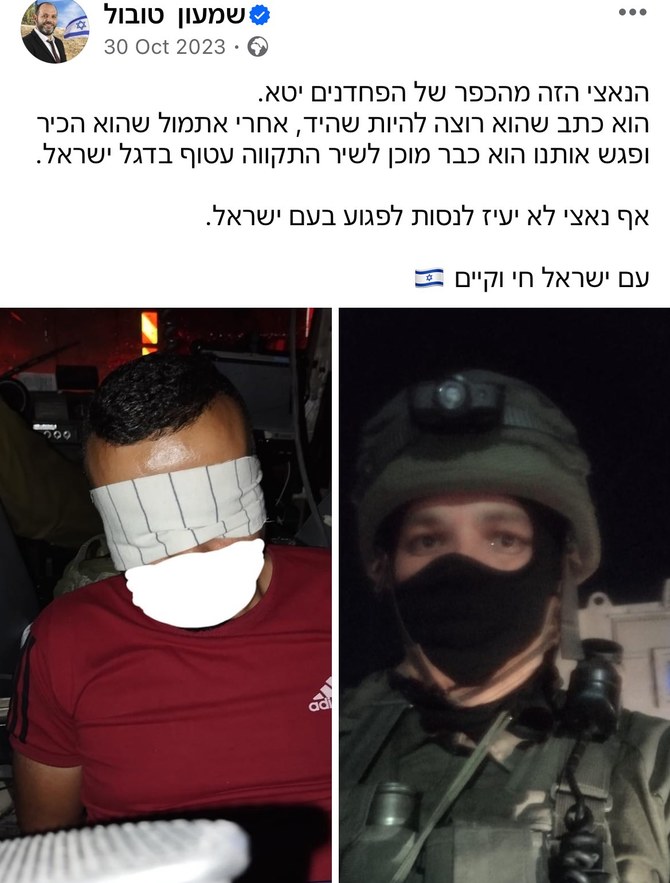 LONDON: The deputy mayor of Be’er Sheva in southern Israel has posted a series of photographs on Facebook showing himself with handcuffed and blindfolded Palestinian detainees.