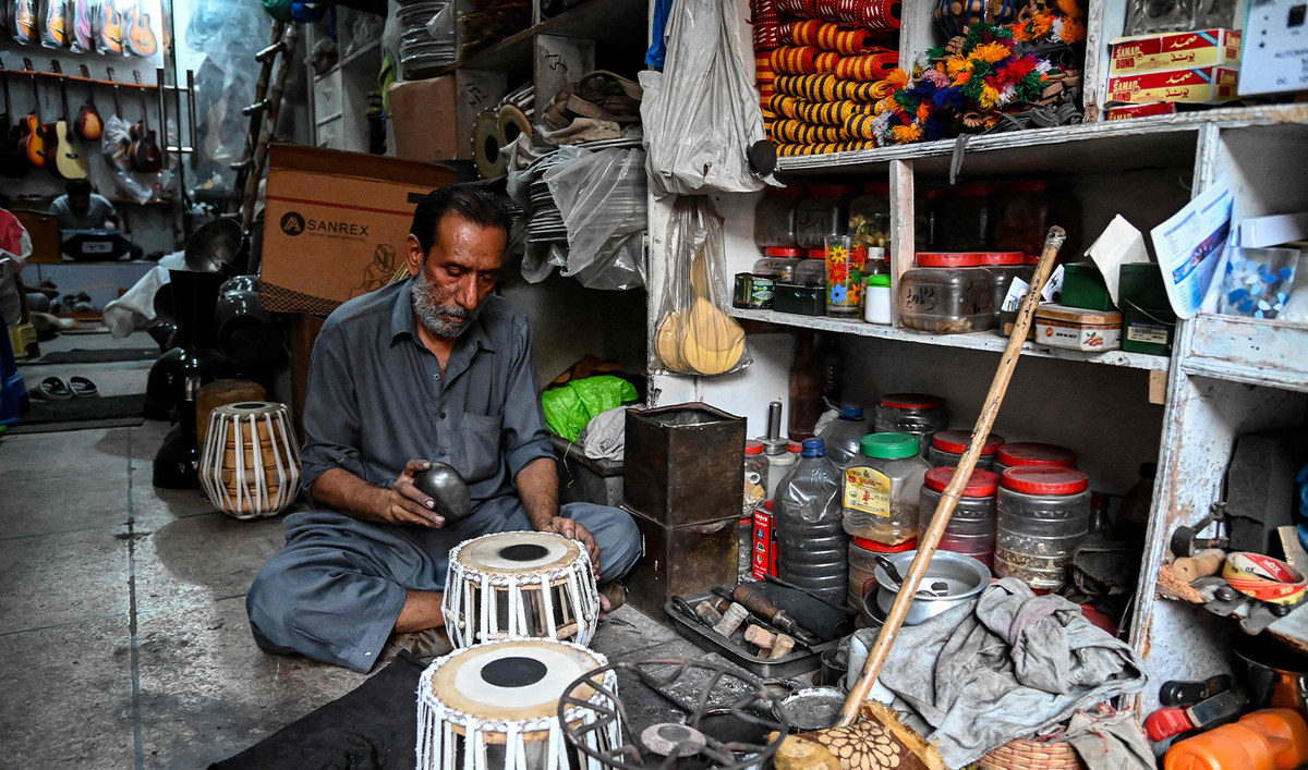 This photograph taken on May 16, 2024 shows a man making a tabla (Indian hand drum) at a music instrument shop near the royal neighborhood of Heera Mandi, a red-light zone, in Lahore. (AFP)