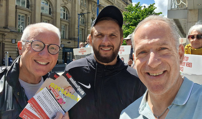 Afridi’s picture was shared by a group called North West Friends of Israel, featuring him with two of its top officials during a street demonstration, where people holding placards can be seen in the background.