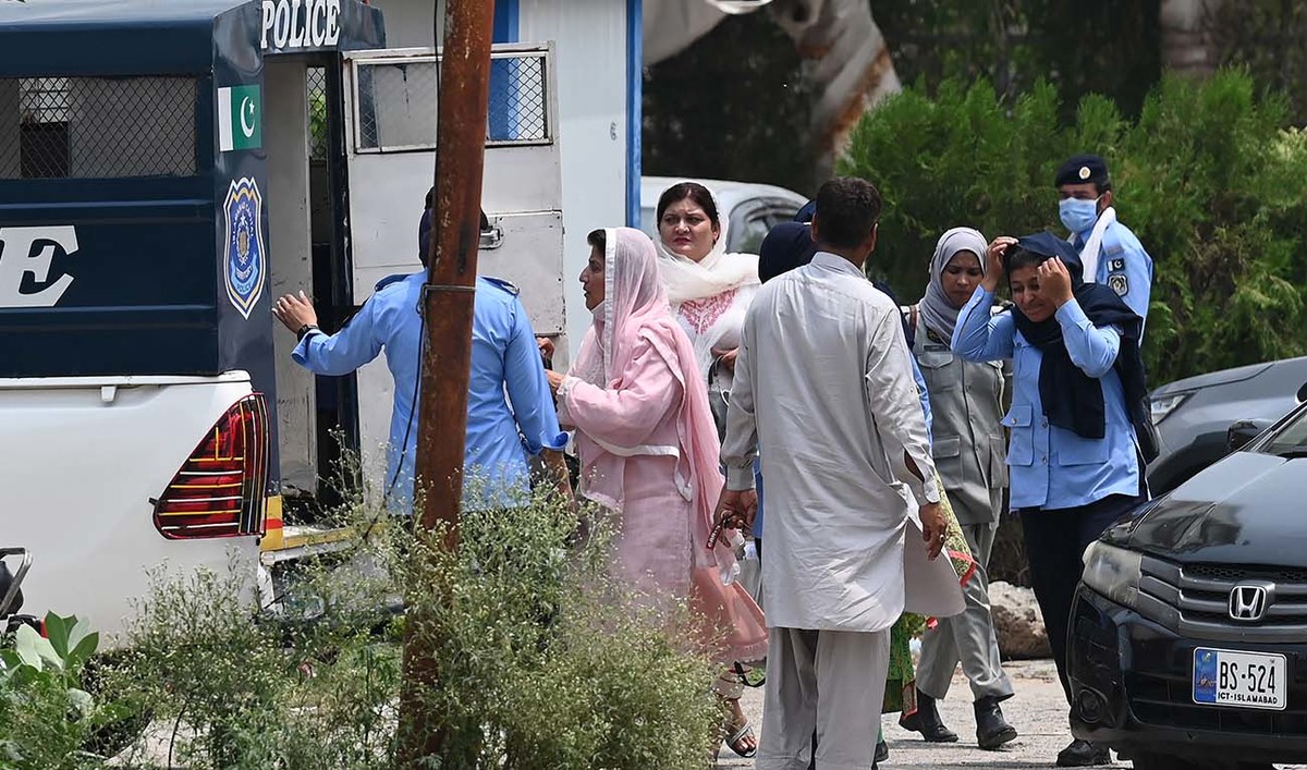Women police officers taking the arrested female workers of the Pakistan Tehreek-e-Insaf (PTI) from the party's headquarters into police van after a security raid in Islamabad on July 22, 2024. (AFP)