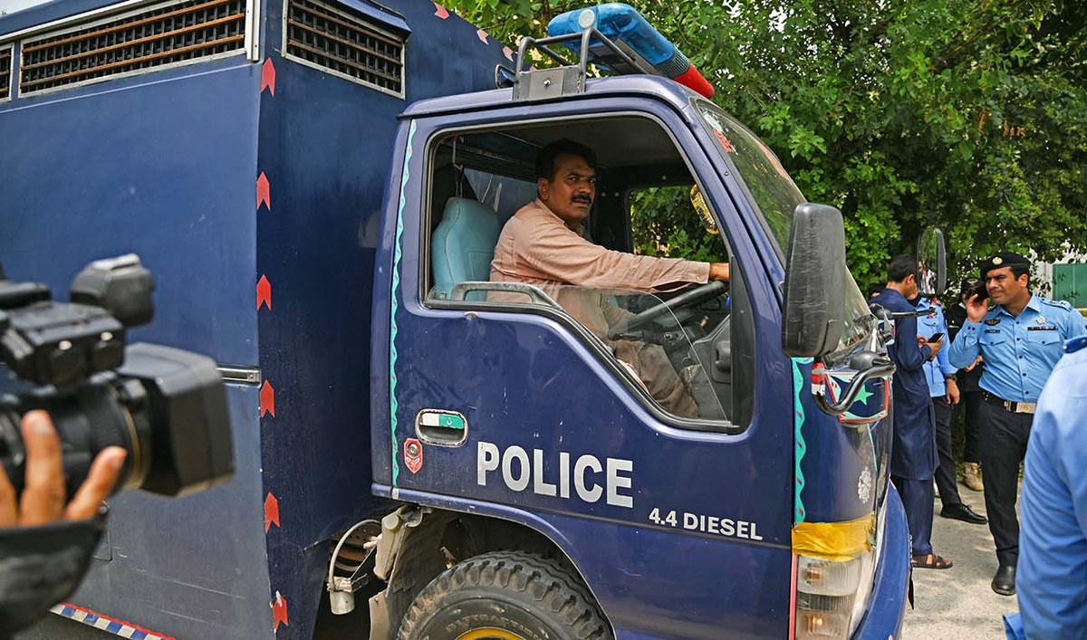 Policemen make way for prison van after a security raid at the Pakistan Tehreek-e-Insaf (PTI) party's headquarters in Islamabad on July 22, 2024. (AFP)