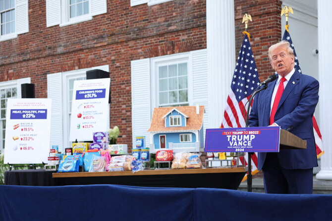Trump was flanked by popular grocery store items, including instant coffee, sugary breakfast cereals and pastries, laid out on tables as he highlighted the cost of everything from food to car insurance to housing. Posters showed the increase of prices for grocery staples.