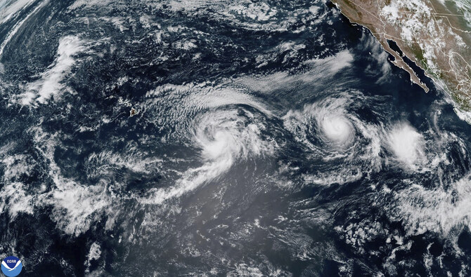 This satellite image provided by the National Oceanic and Atmospheric Administration (NOAA) shows Hurricane Gilma and Tropical Storm Hone, located west-southwest of the southern tip of the Baja California peninsula of Mexico, Thursday, Aug. 22, 2024. (AP)
