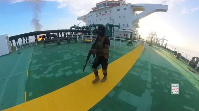 DUBAI, United Arab Emirates: Yemen’s Houthi rebels released footage on Thursday showing their fighters boarded and placed explosives on a Greek-flagged tanker, setting off blasts that put the Red Sea at risk of a major oil spill. The vessel was abandoned earlier, after the Houthis repeatedly attacked it.