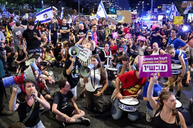LONDON: The message on the placard held by one of the tens of thousands of Israelis who flooded on to the streets of Tel Aviv on Sunday was as clear as it was damning: “Bibi, their blood is on your hands.”