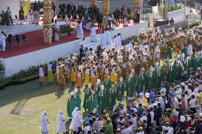 An estimated 35,000 people filled the stadium in the capital Port Moresby for the morning Mass. It began with dancers in grass skirts and feathered headdresses performing to traditional drum beats as priests in green vestments processed up onto the altar.