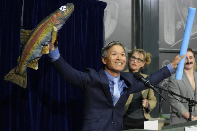 James Liao, a biology professor at the University of Florida, accepted the physics prize for his study demonstrating and explaining the swimming abilities of a dead trout.