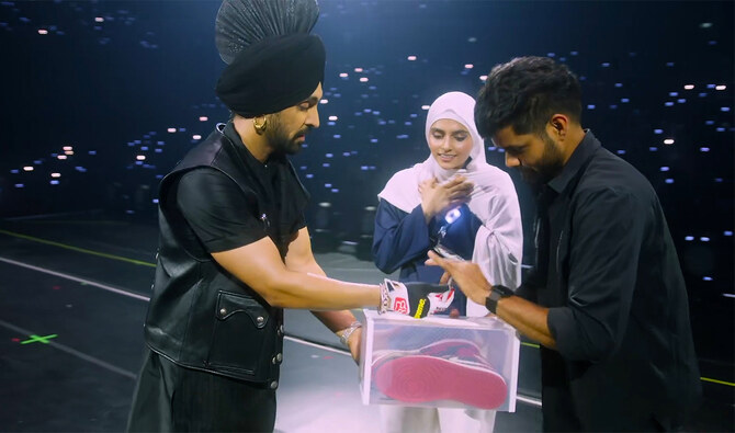 Dosanjh, who was performing at a concert in Manchester on Saturday as part of his “Dil-luminati” tour of Europe, called a female fan onstage to gift her a pair of shoes. When the fan told him she was from Pakistan, the Indian singer urged the crowd to give her a huge round of applause.