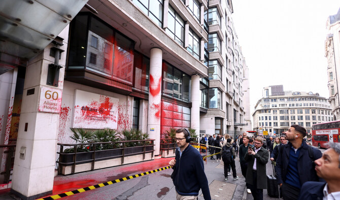 LONDON: Pro-Palestinian activists targeted the British offices of German financial services firm Allianz on Tuesday, daubing the outside with red paint in protest over the company’s links to Israeli defense firm Elbit Systems.