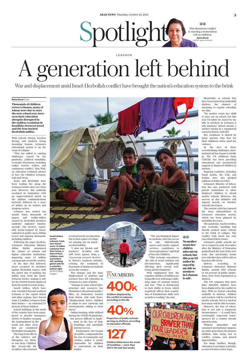 DUBAI: Thousands of children across Lebanon, many of whom were due to start the new school year, have seen their education abruptly disrupted by the sudden escalation in hostilities between Israel and the Iran-backed Hezbollah militia.