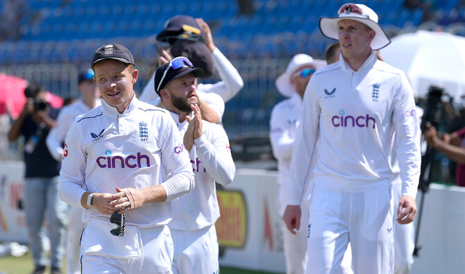 England's Ollie Pope, left, and teammates walk off the field after winning the first test cricket match against Pakistan, in Multan, Pakistan, on October 11, 2024. (AP/File)