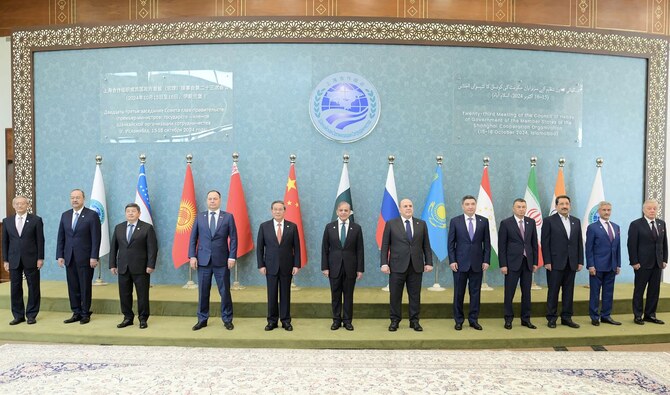 This handout photograph taken on October 16, 2024 and released by Pakistan's Press Information Department (PID) shows Pakistan's Prime Minister Shehbaz Sharif (C front) posing for a group picture with the heads of the delegate members during the Shanghai Cooperation Organisation (SCO) summit, in Islamabad. The SCO comprises China, India, Russia, Pakistan, Iran, Kazakhstan, Kyrgyzstan, Tajikistan, Uzbekistan and Belarus -- with 16 more countries affiliated as observers or "dialogue partners". (AFP)
